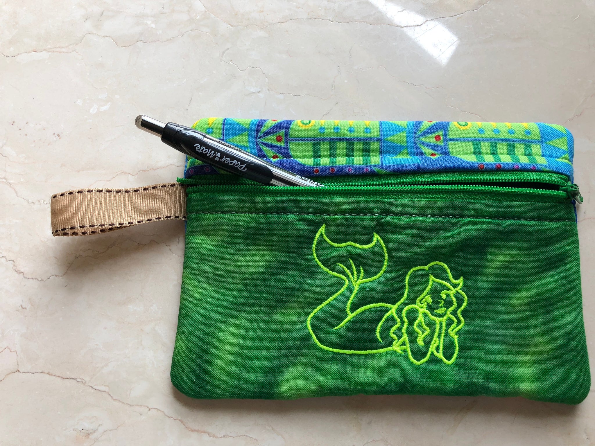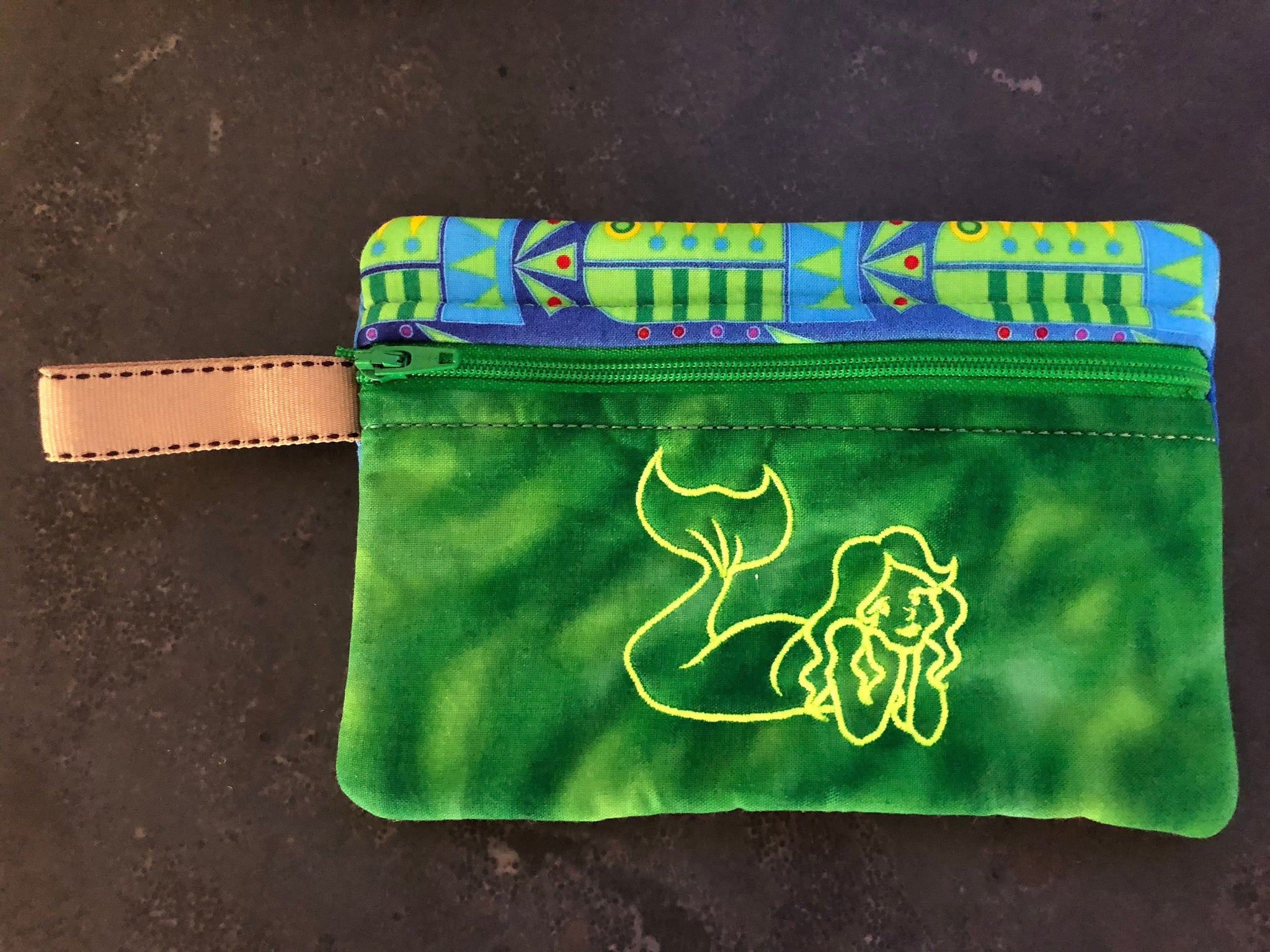 Pretty little embroidered Mermaid pouch. Perfect for Mermaid lovers or anyone who loves the sea. Handmade embroidered zippered purse 4.5" X 6.5". Fully lined with cute ribbon loop for a handle. All 100% pre washed Cotton fabric with cotton batting. Ribbon is polyester. Machine washable, but I would suggest air dry. Embroidery can be personalized for no additional charge. If you want this, please indicate this on your order with correct spelling. Fonts are at my discretion. Very long names may not fit -- the bag is only 4.5" X 6.5"!